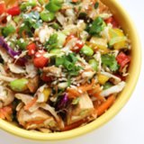 - Place the chicken, edamame, bell peppers, carrots, and coleslaw mix in a large bowl. Toss to combine.