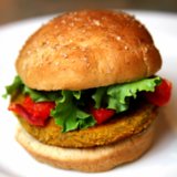 - Heat the remaining tablespoon of oil in a large pan on medium heat. Place heaping spoonfuls of the mixture onto the hot pan, and use the back of the spoon to pat them flat and form four-inch diameter patties. Brown both sides of each burger. Serve on a bun with one piece of the roasted pepper, sliced into thirds.